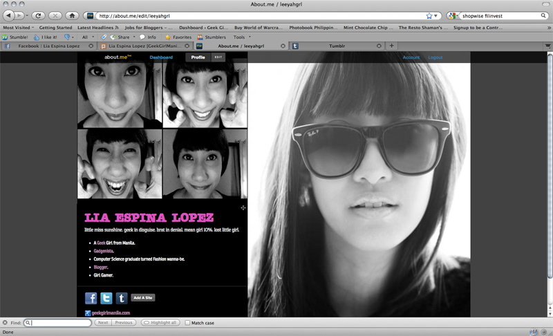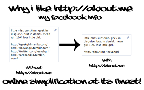 With so many social media sprouting like mushroom all over the internet, we just end up with a gazillion net addresses like twitter.com/leeyahgrl, or facebook.com/liaespinalopez, leeyahgrl.tumblr.com, plurk.com/gadgenista and so on. Now what About Me does is consolidate all those net addresses into one site, about.me/leeyahgrl.