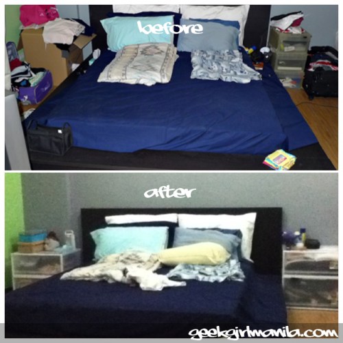 Before and after pictures of our bedroom. Yay, no more waking up to a balikbayan box beside my side of the bed. And they double as side tables, too!