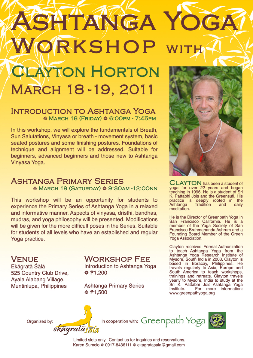 But anyway, for those looking to do yoga in Alabang, there’s going to be another Ashtanga Yoga workshop in Clay Horton at Ekāgratā Śālā!
