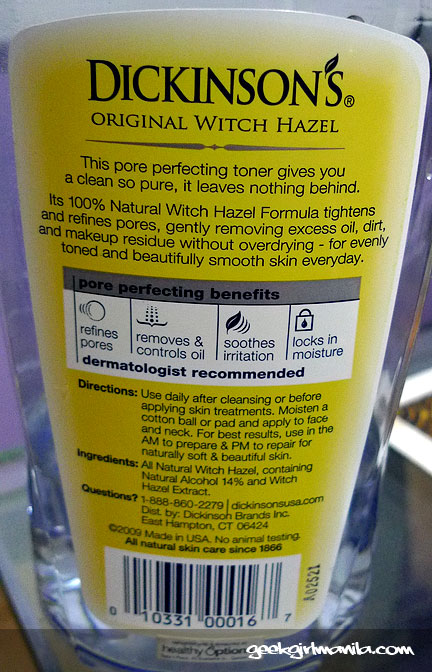 For the past 5 years, I’ve been religiously using Dickinson’s Original Witch Hazel as my toner. Definitely my HG. Washing my face never feels completely clean if I don’t use it.