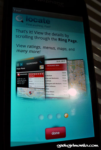 Locate is a location-based search engine, which allows users to search for the nearest restaurants, stores, gas stations, ATMs, or just about anything in the Philippines.