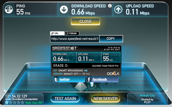 The speed of 6MB/s is pretty far from the promised up to 20MB/s speed. (I still have yet to try it out in other areas, like Makati for example, or even outside of Manila. Like what I said in my review of the SMART Rocket Plug-It, location is the key!)