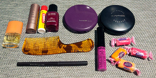 Inside the makeup pouch are the following: mini Happy Clinique, Sugar Lip Tint, Carmex Lip Balm, nail polish just in case I decide to go on a mani-pedi, Human Heart Nature face powder, face blot, a comb, eyeliner, lip stick and some candies when I get hypoglycemic attacks.