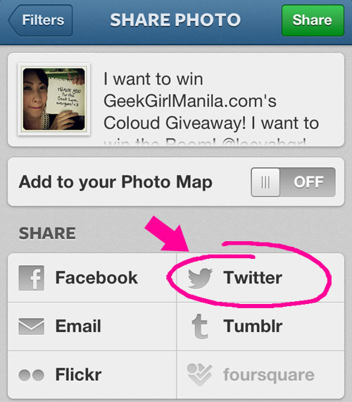 5. If you don’t have Instagram, you can still join by tweeting your photo with the message “Join GeekGirlManila.com’s Coloud Giveaway at http://www.geekgirlmanila.com”.