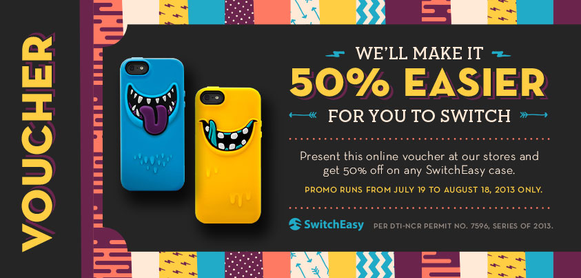 - Online Voucher – Print the online voucher found below and present it to any of the participating stores to get 50% off on any SwitchEasy case.